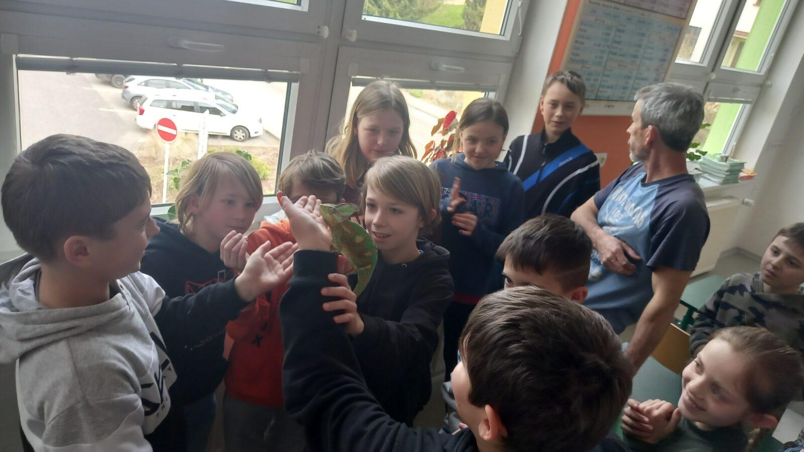 Zvládli byste se dotknout metr a půl dlouhé krajty? Víte, jak poznat, že je chameleon „naštvaný“? Nebo jestli má víc končetin stonožka, nebo mnohonožka? Žáci pátého, šestého a sedmých ročníků to mohli zkusit a informace získat. Ve škole je 20. dubna navštívil chovatel exotických zvířat pan Pecháček z Líšnice, předvedl několik zástupců bezobratlých živočichů (např. sklípkana, kudlanku, štíra, stonožku, zákeřnici), ukázal i obratlovce (krajtu a chameleona) a podělil se o své zkušenosti s chovem a péčí o tato exotická stvoření.