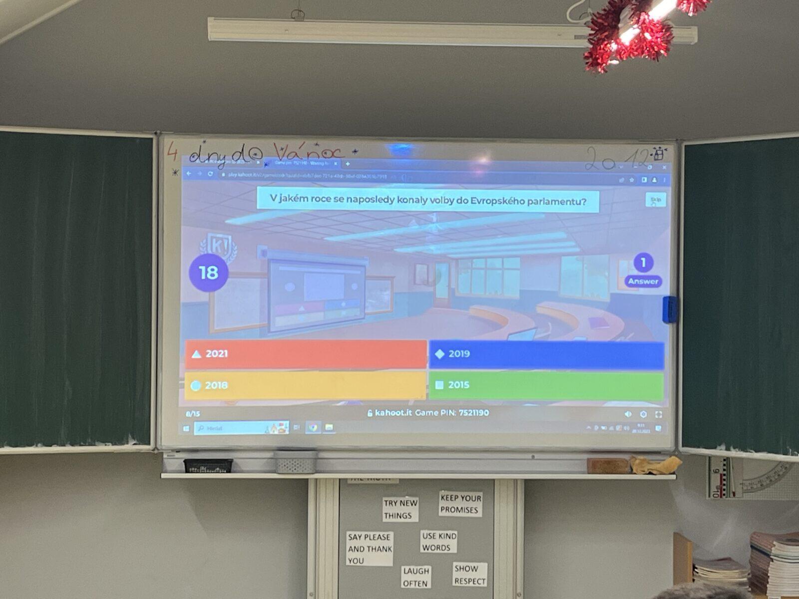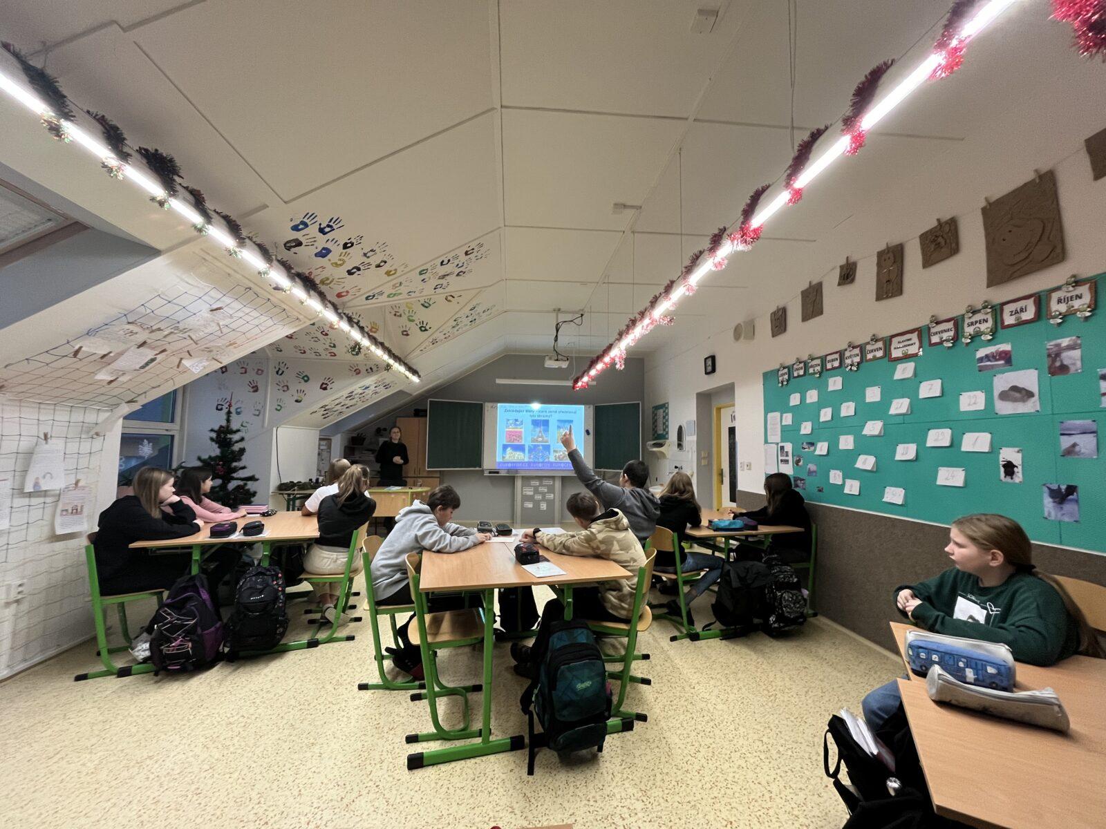 Ve středu 20.12. navštívila naši školu pracovnice Evropského centra Lucie Boukalová. Seznámila žáky 7. třídy a 8.A s tím, co je Evropská unie, s její historií, fungováním, symboly. V tomto předvánočním čase nechyběla ani zmínka o různých způsobech slavení těchto svátků v evropských zemích. Na závěr si žáci otestovali svou pozornost v kvízech.