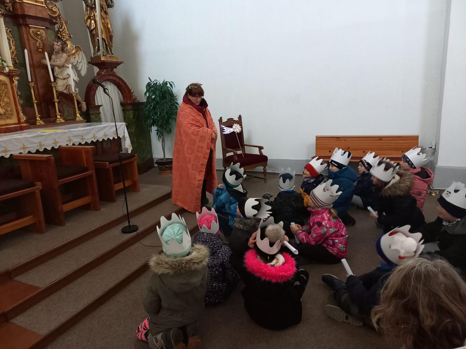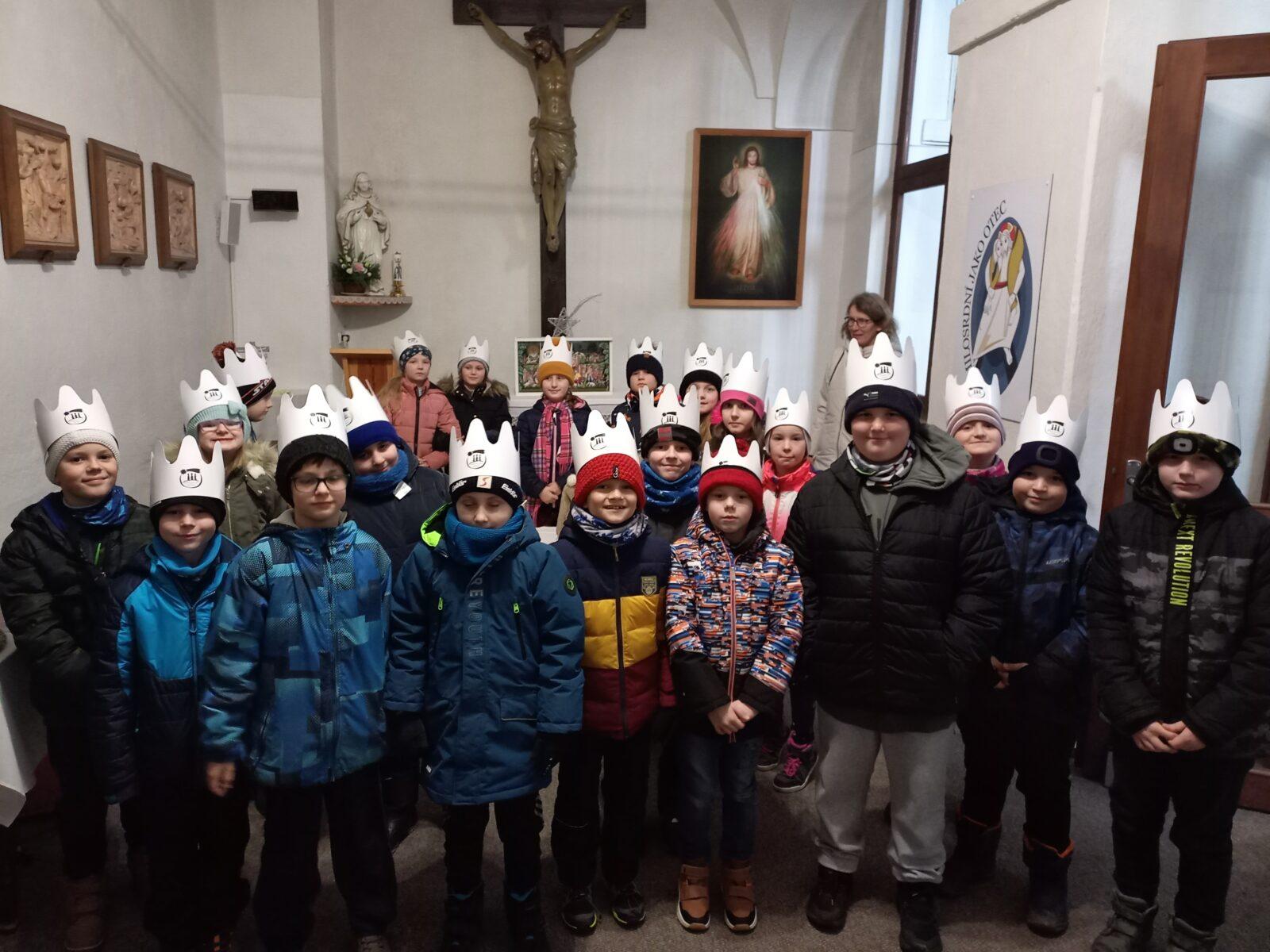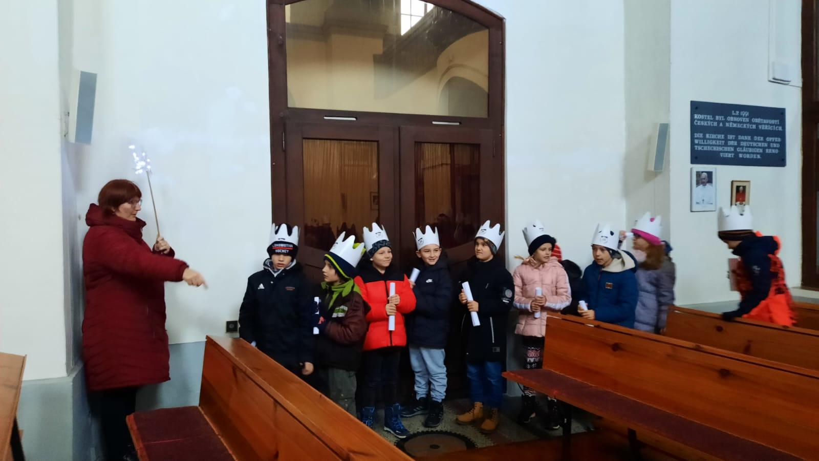 V pátek 5. 1. se naši prvňáčci, druháčci a třeťáčci vydali do místního kostela, kde pro ně byl připraven hravý a zároveň poučný program, jež dětem přiblížil příběh "Tří králů." Děti se na malou chvíli staly "mudrci" a společně putovaly za hvězdou, která je přivedla do Betléma. Paní Poslušné a paní Pecháčkové patří velké poděkování za pěkně promyšlený program, který děti zaujal a potěšil.