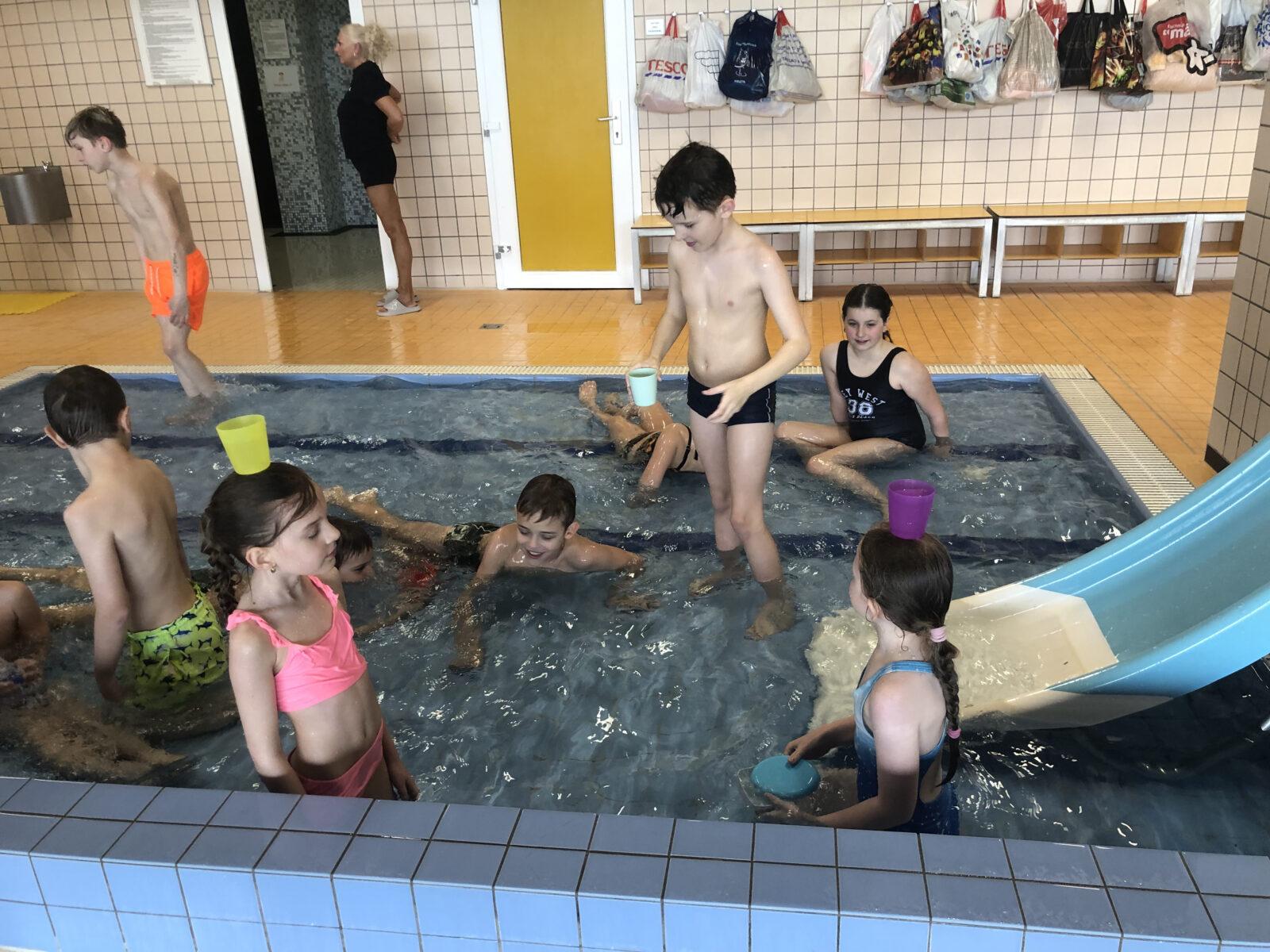 Na poslední lekci se všichni moc těšili. Děti měly volnou zábavu ve vodě - každý si mohl přinést nějakou nafukovací hračku, vodní pistolky nebo potápěčské brýle. Kdo chtěl, mohl jezdit i na tobogánu, který byl pro mnohé velkým zážitkem a krásnou tečkou za celým kurzem.