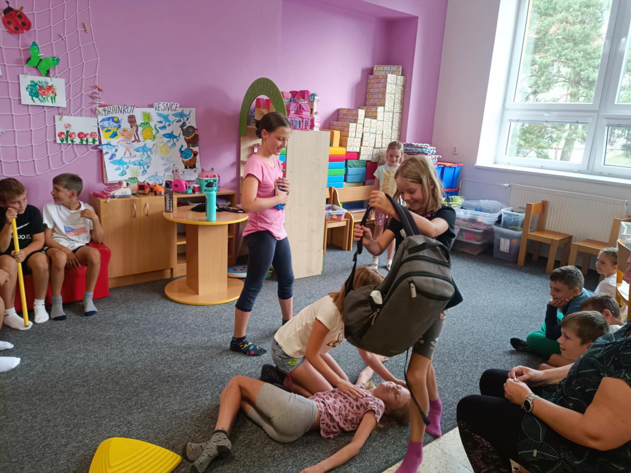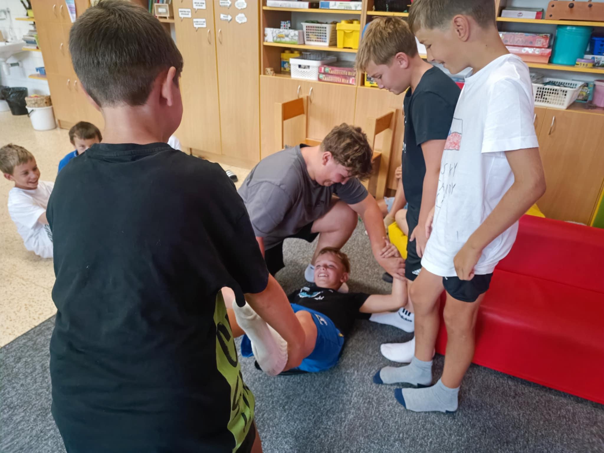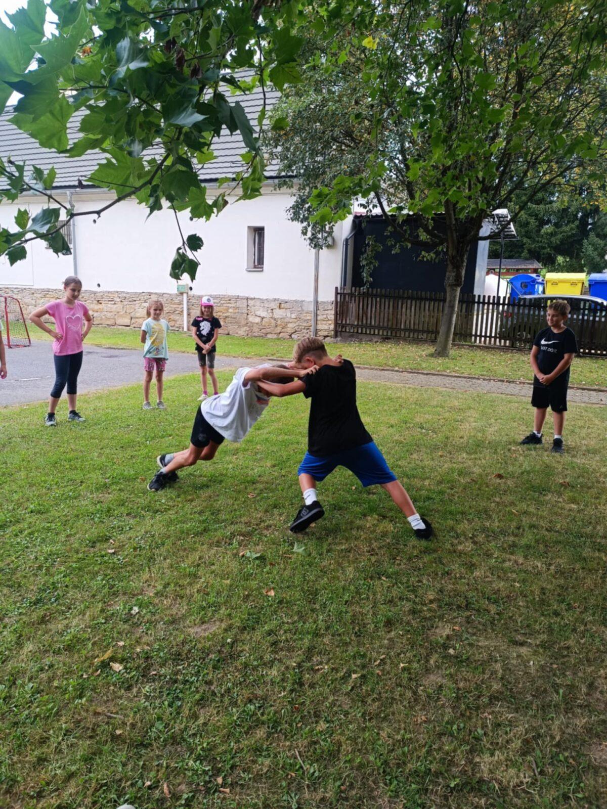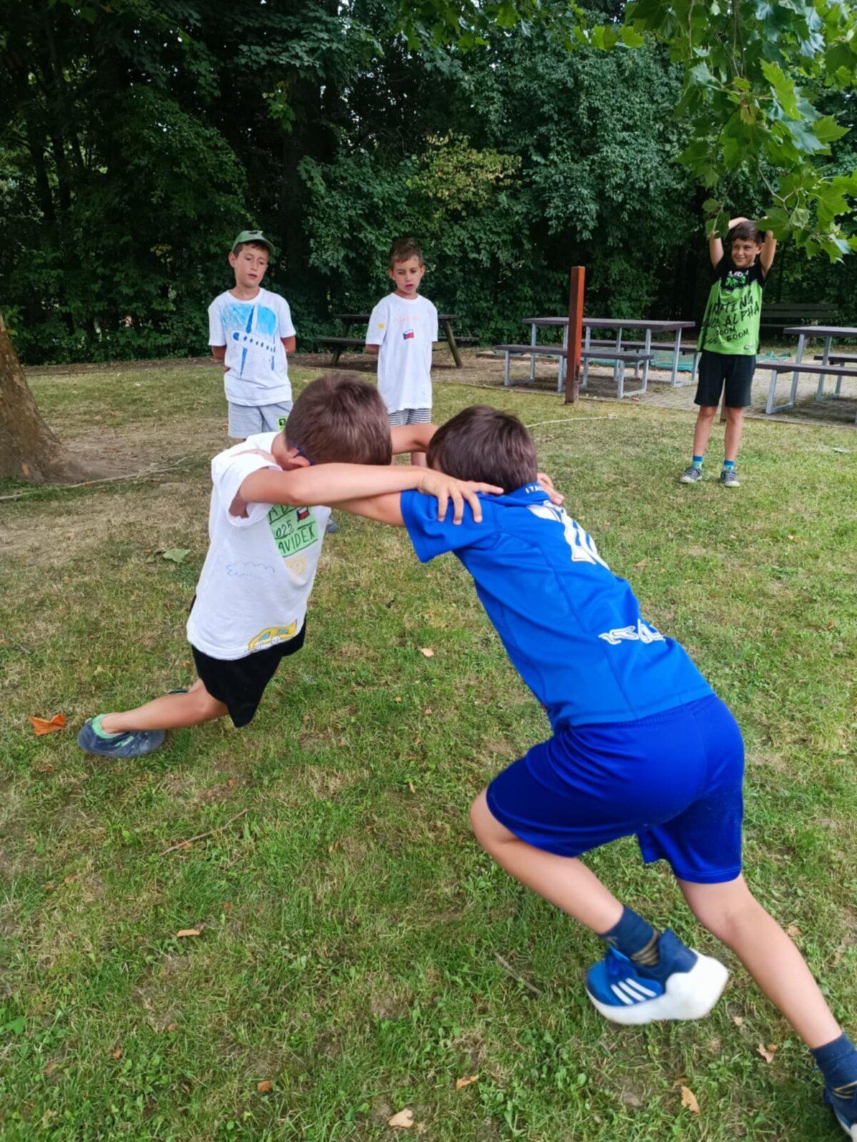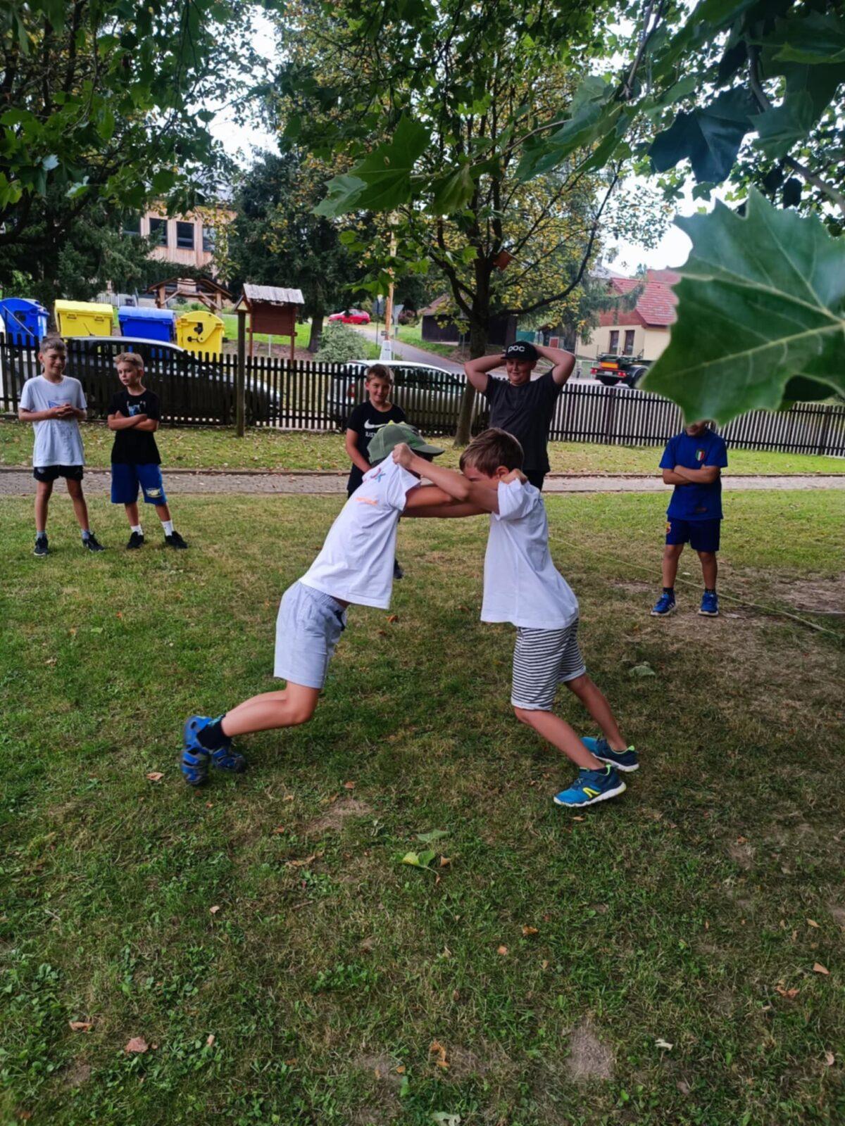 Dnes, ve čtvrtek, jsme se na táboře dopoledne věnovali tématu ohrožení – povídali jsme si o tom, jak se chovat při zdravotních potížích a kdy je potřeba volat hasiče nebo policii. Děti k tomu připravily naprosto úžasné scénky, ve kterých předvedly, že si umí poradit i v těžkých situacích. Poté jsme se přesunuli ven, kde jsme si zasoutěžili v přetahování a porovnávání sil.