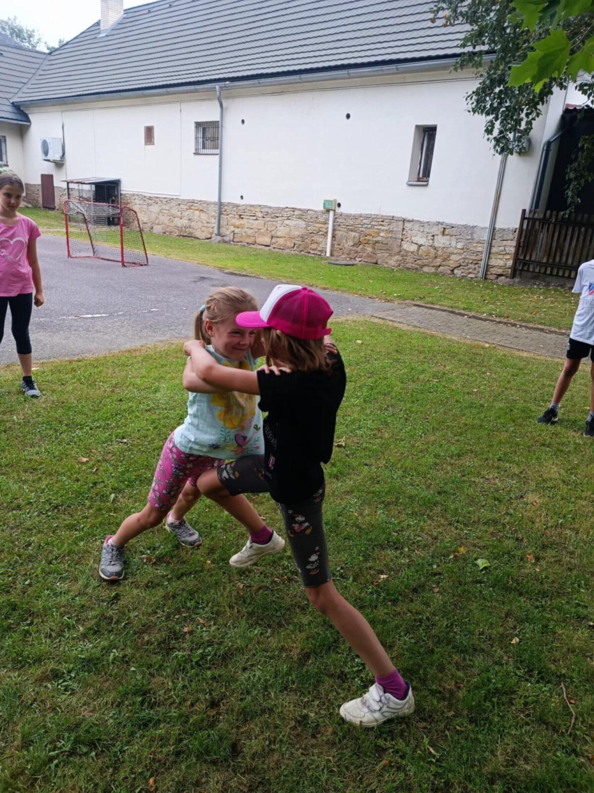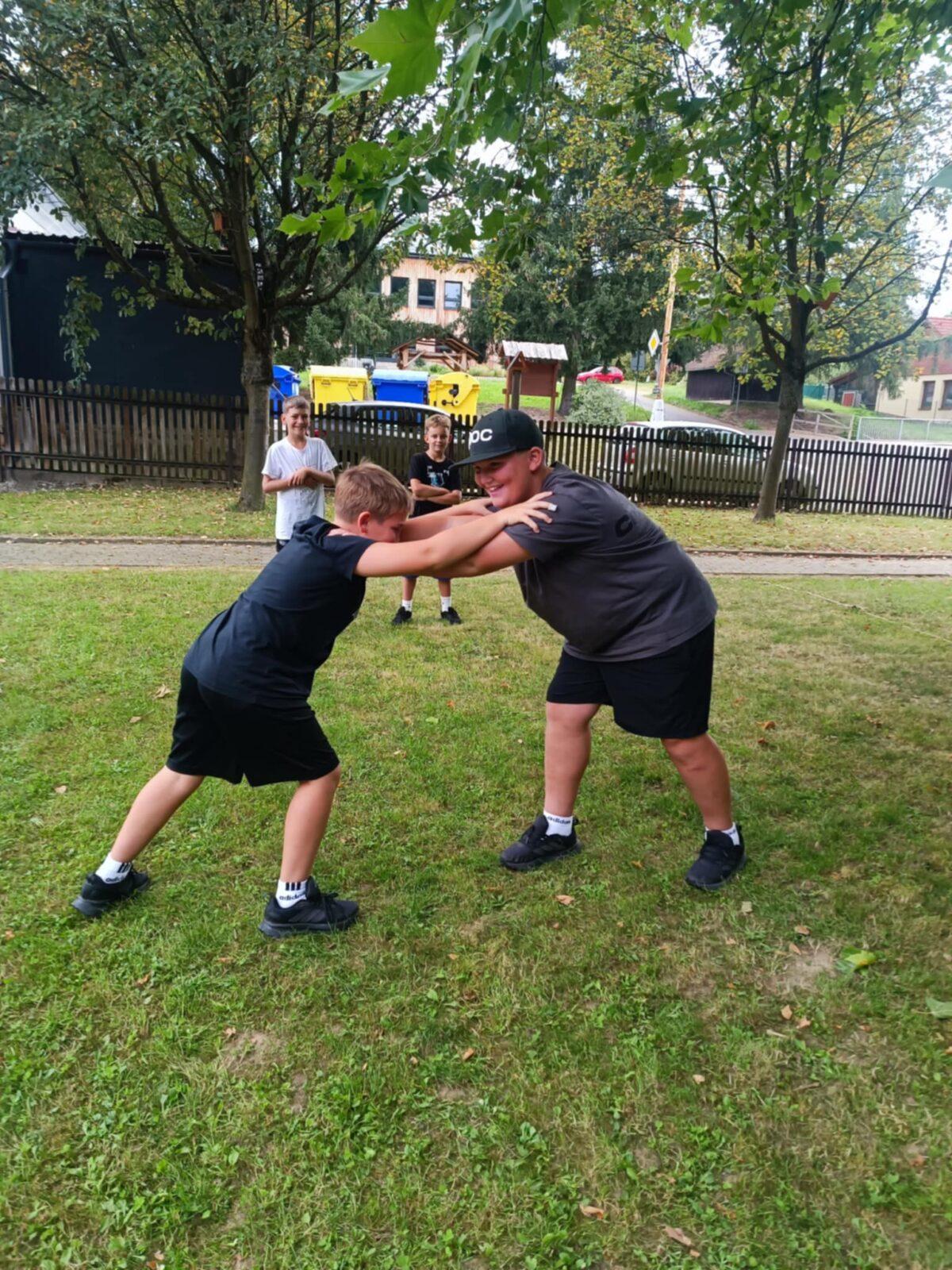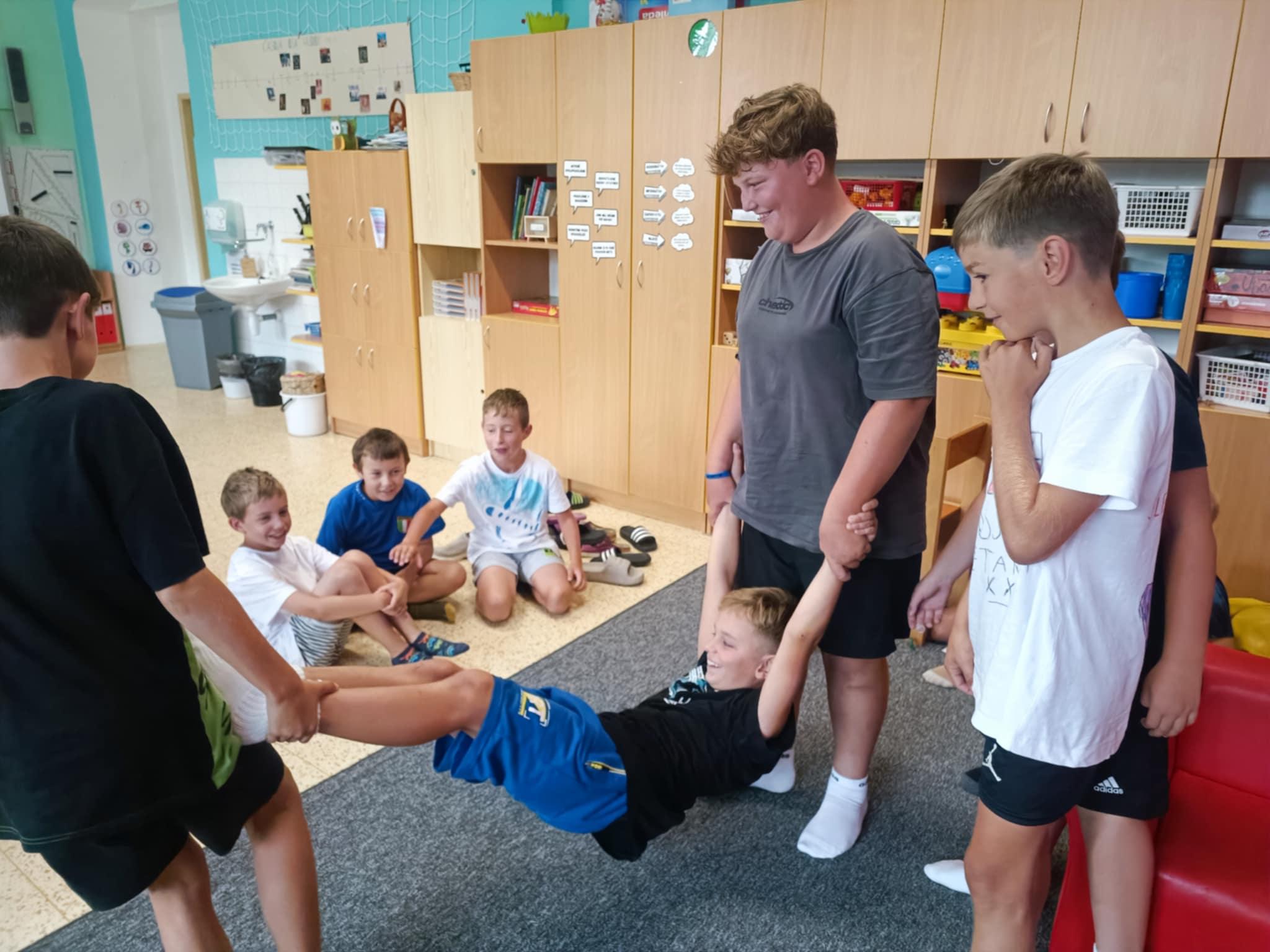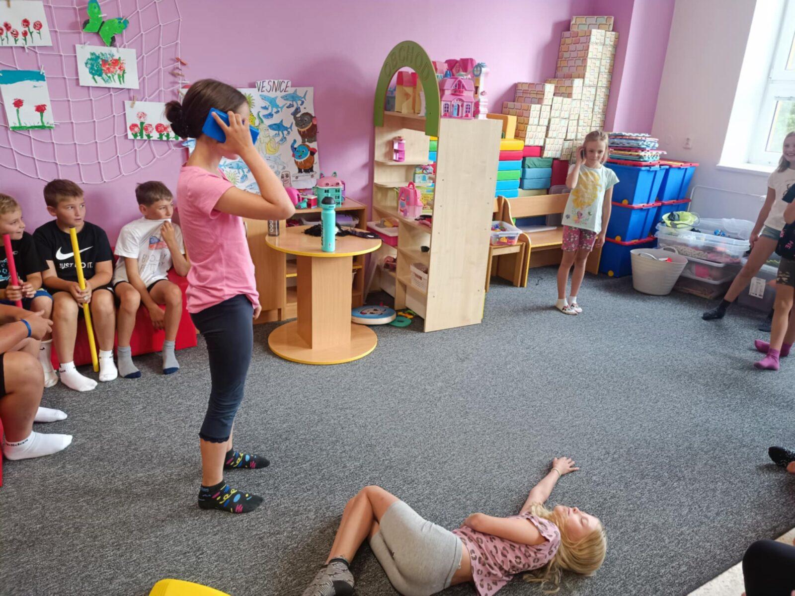 Dnes, ve čtvrtek, jsme se na táboře dopoledne věnovali tématu ohrožení – povídali jsme si o tom, jak se chovat při zdravotních potížích a kdy je potřeba volat hasiče nebo policii. Děti k tomu připravily naprosto úžasné scénky, ve kterých předvedly, že si umí poradit i v těžkých situacích. Poté jsme se přesunuli ven, kde jsme si zasoutěžili v přetahování a porovnávání sil.