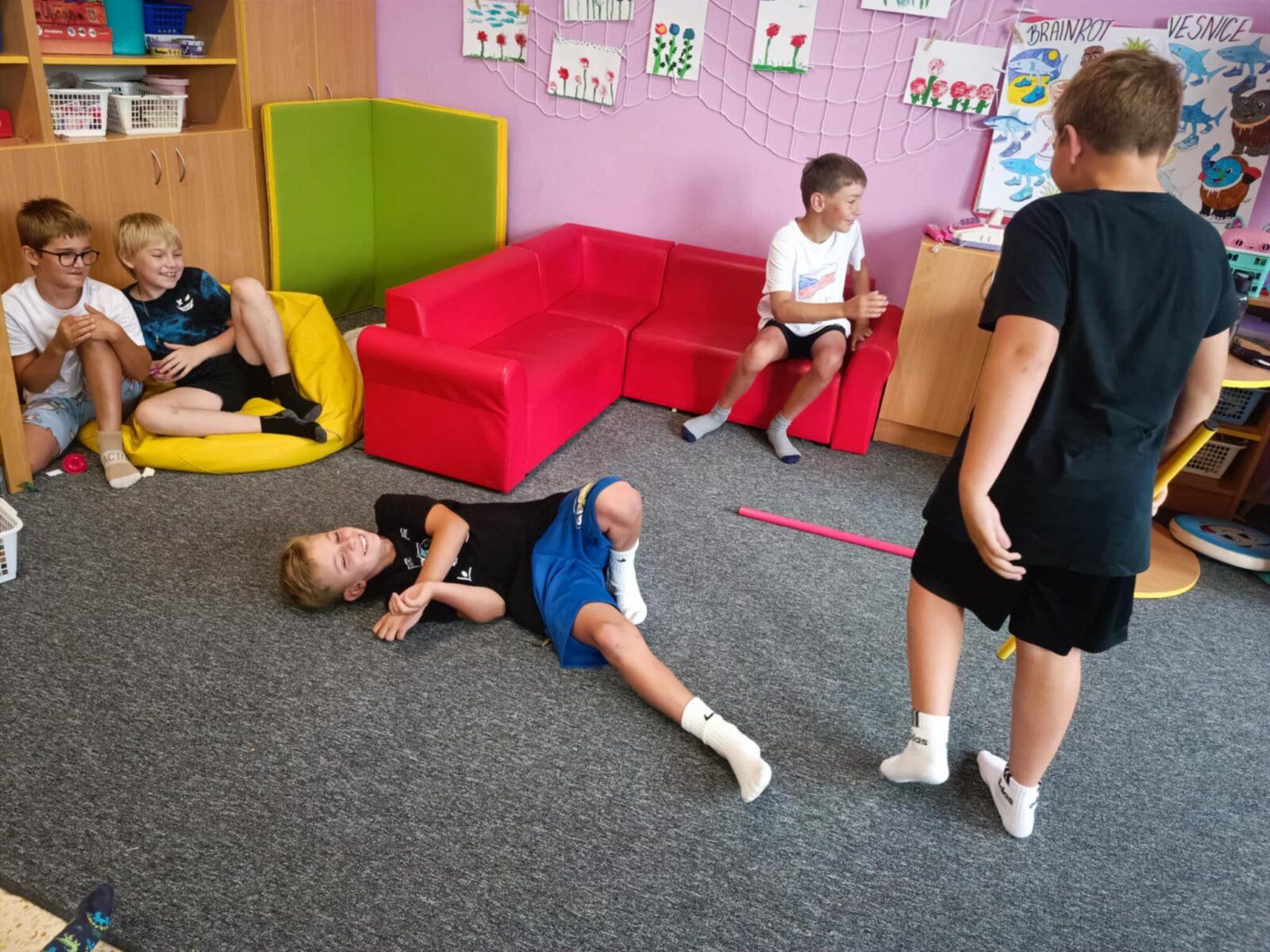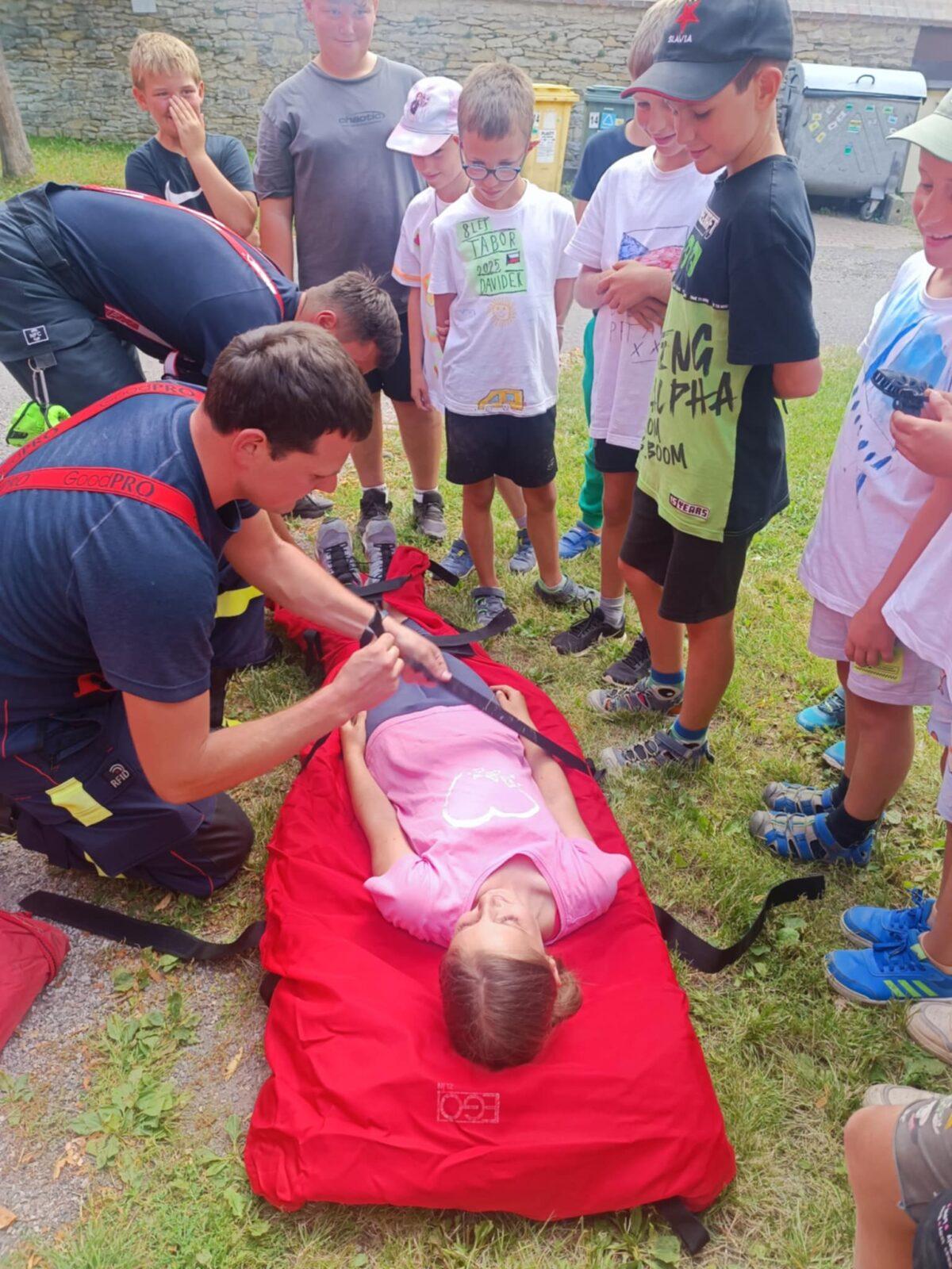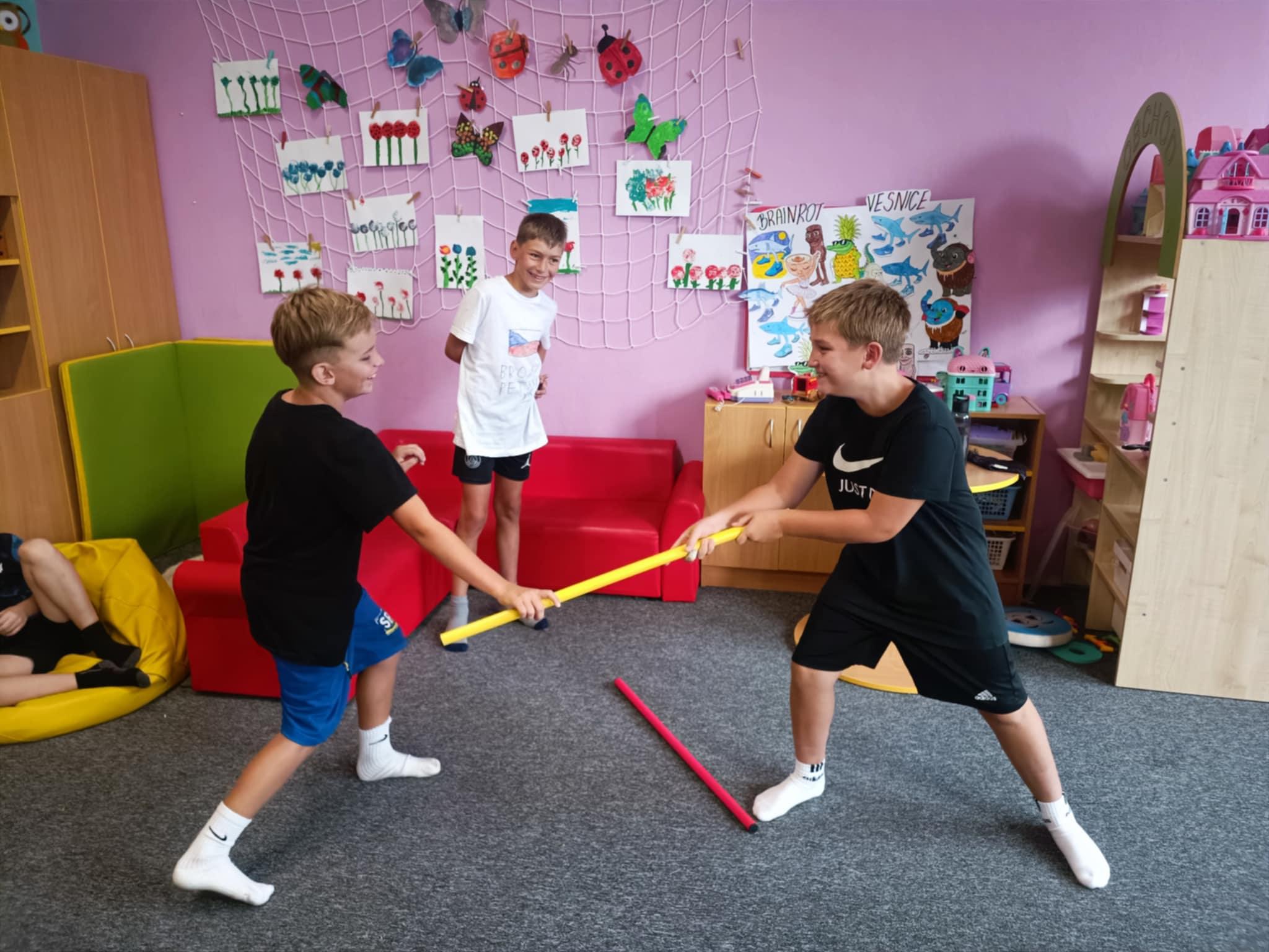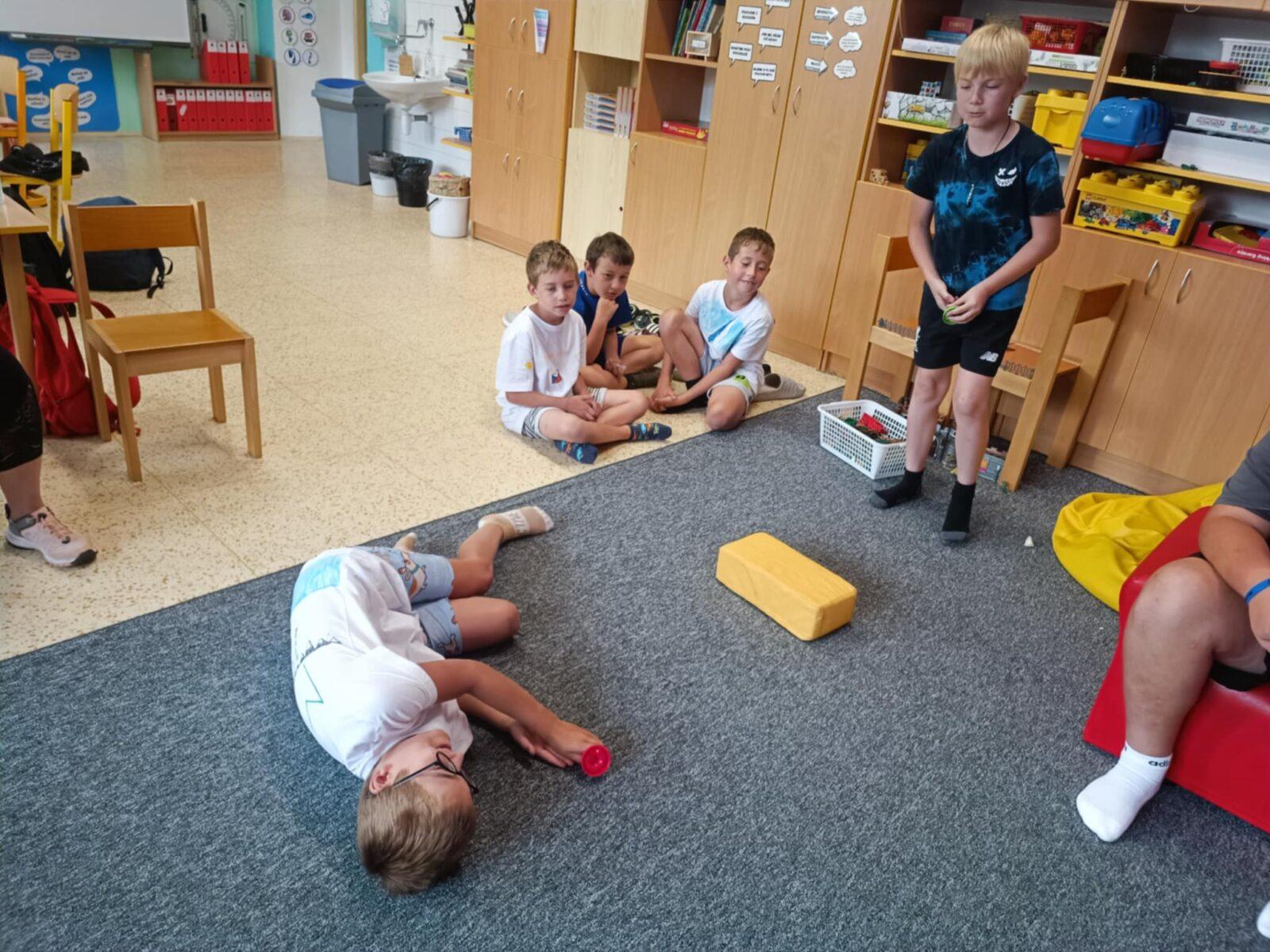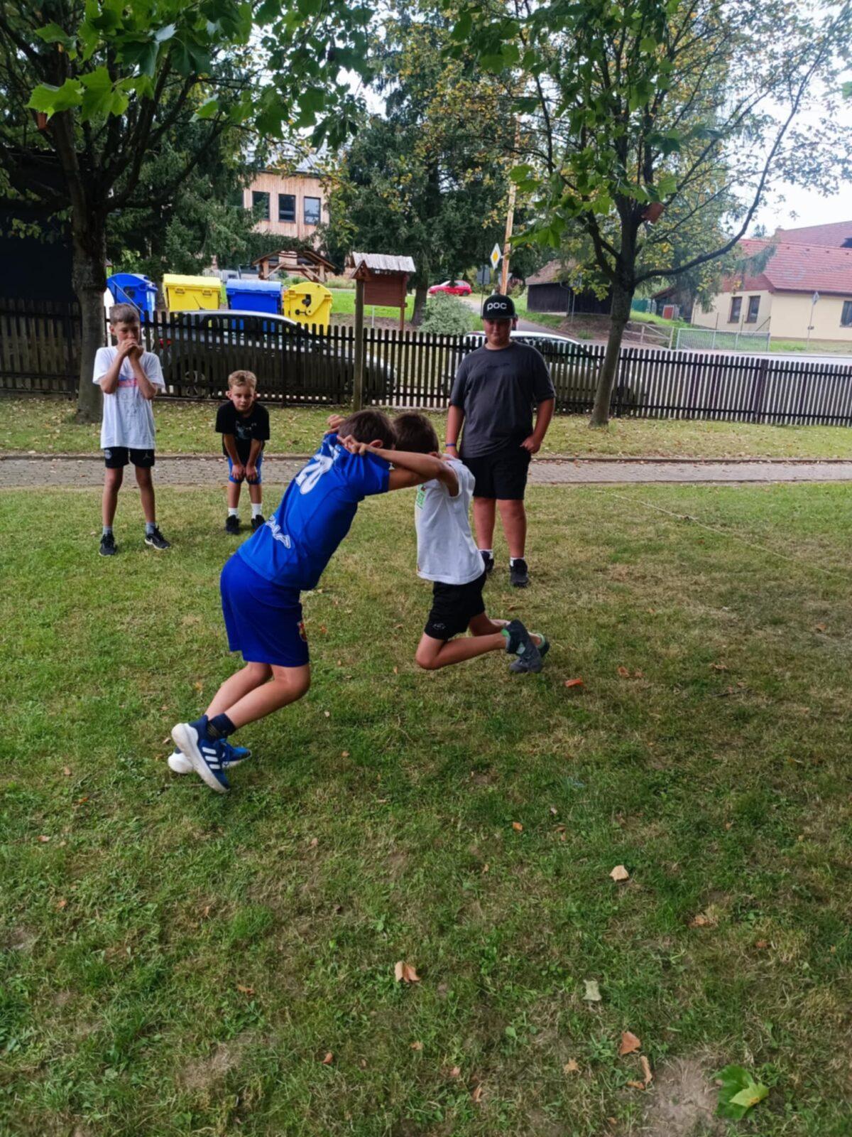 Dnes, ve čtvrtek, jsme se na táboře dopoledne věnovali tématu ohrožení – povídali jsme si o tom, jak se chovat při zdravotních potížích a kdy je potřeba volat hasiče nebo policii. Děti k tomu připravily naprosto úžasné scénky, ve kterých předvedly, že si umí poradit i v těžkých situacích. Poté jsme se přesunuli ven, kde jsme si zasoutěžili v přetahování a porovnávání sil.