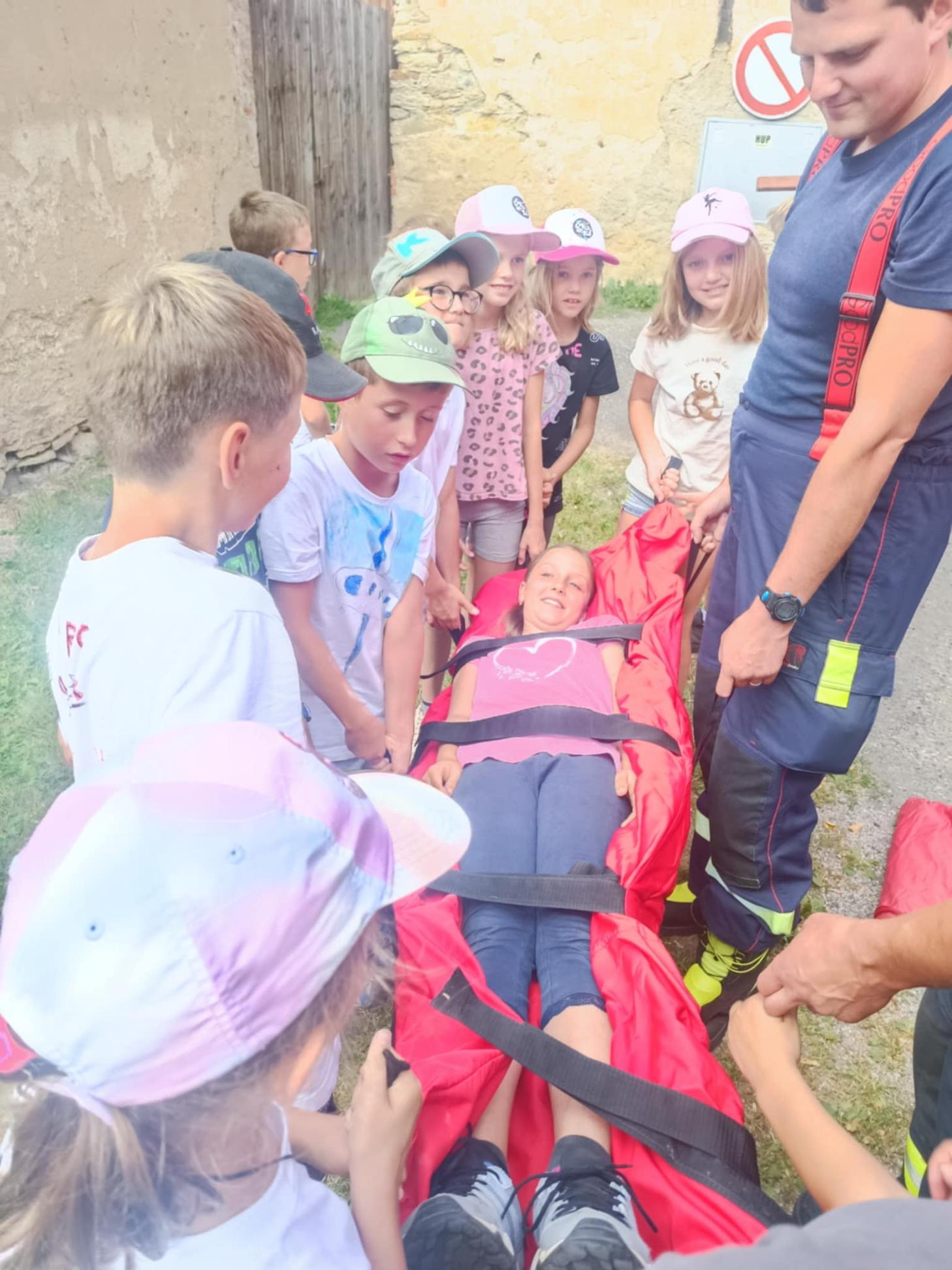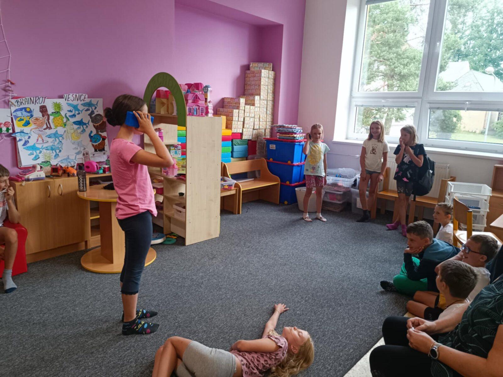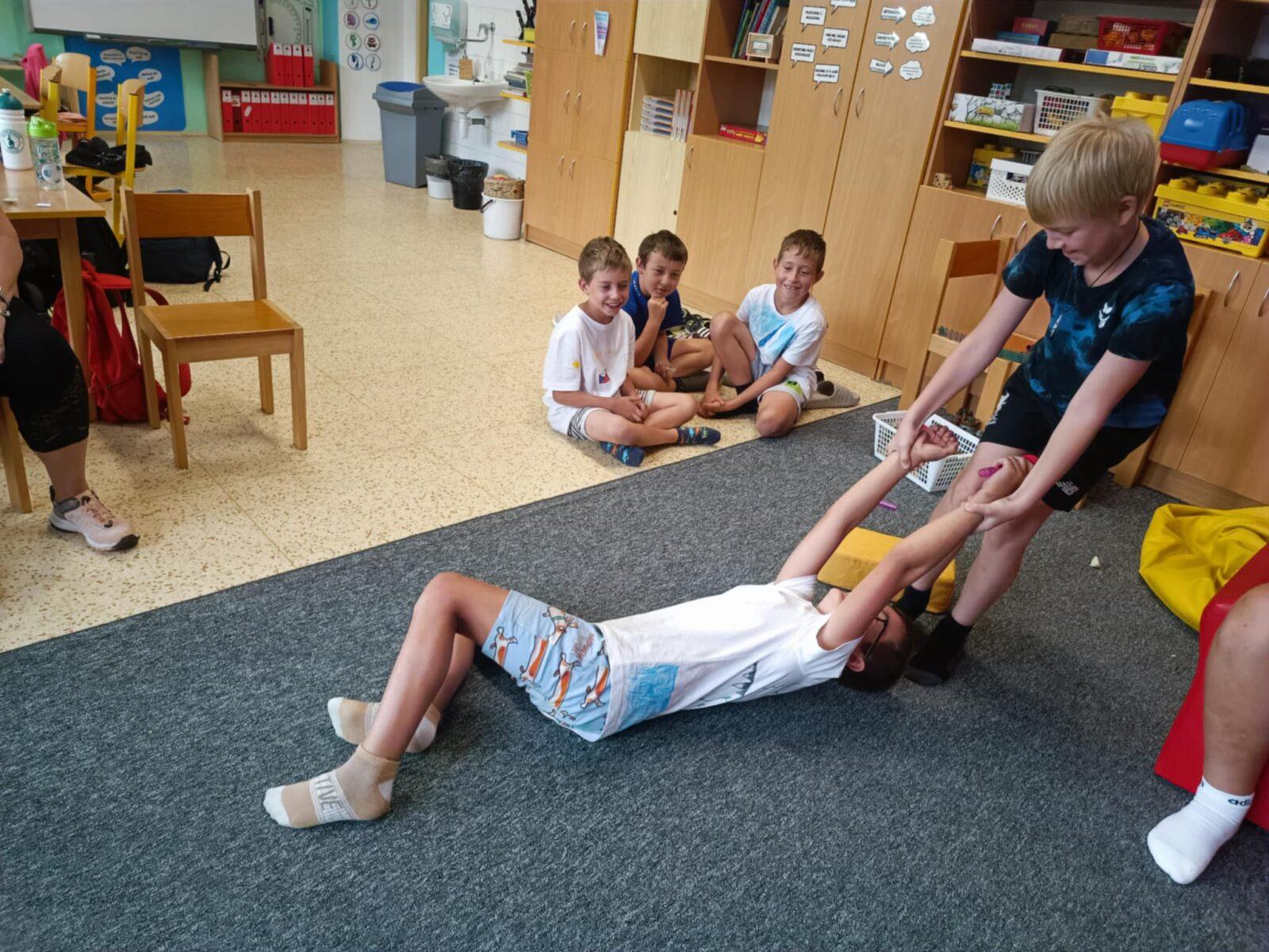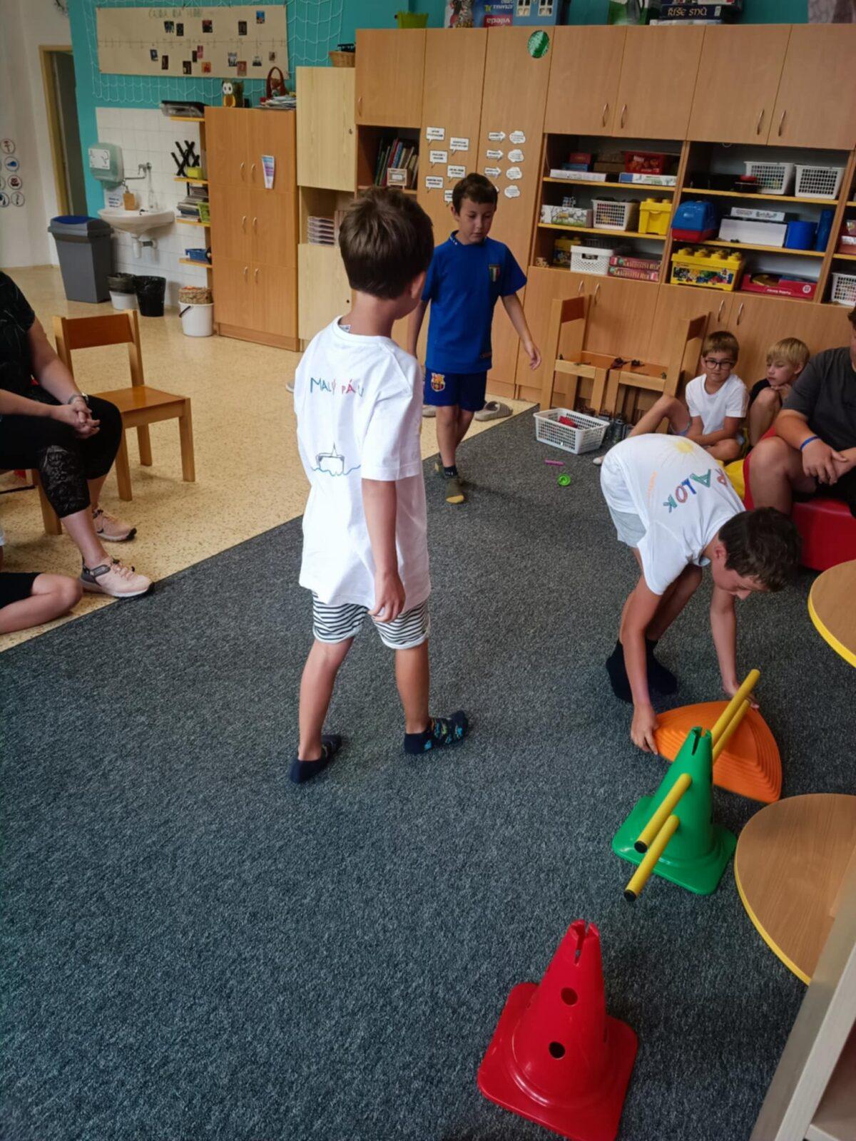 Dnes, ve čtvrtek, jsme se na táboře dopoledne věnovali tématu ohrožení – povídali jsme si o tom, jak se chovat při zdravotních potížích a kdy je potřeba volat hasiče nebo policii. Děti k tomu připravily naprosto úžasné scénky, ve kterých předvedly, že si umí poradit i v těžkých situacích. Poté jsme se přesunuli ven, kde jsme si zasoutěžili v přetahování a porovnávání sil.